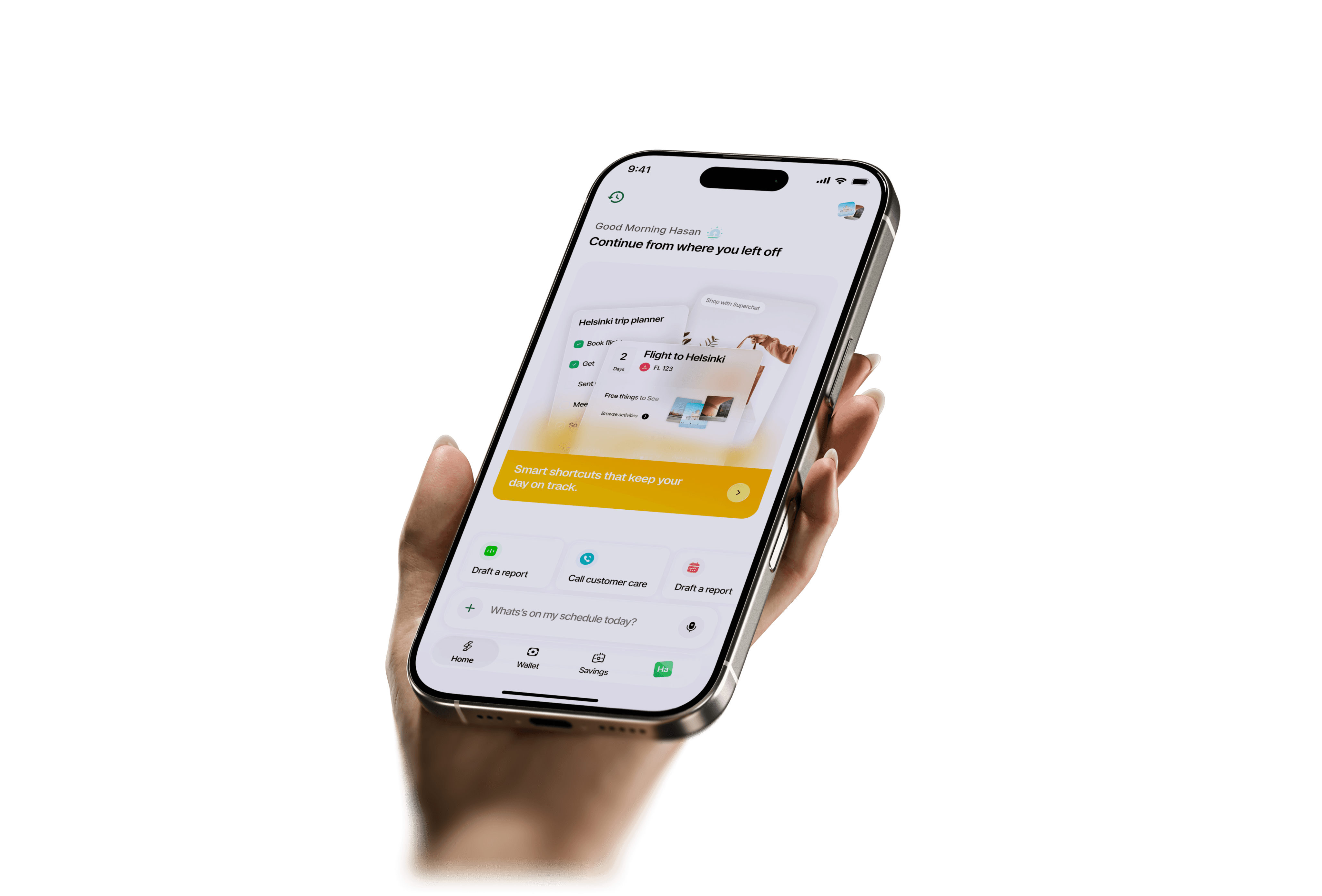 Our goal is to save you hours every day. We combine the research phase with the booking phase. Experience a unified chat for smart planning and connected services.