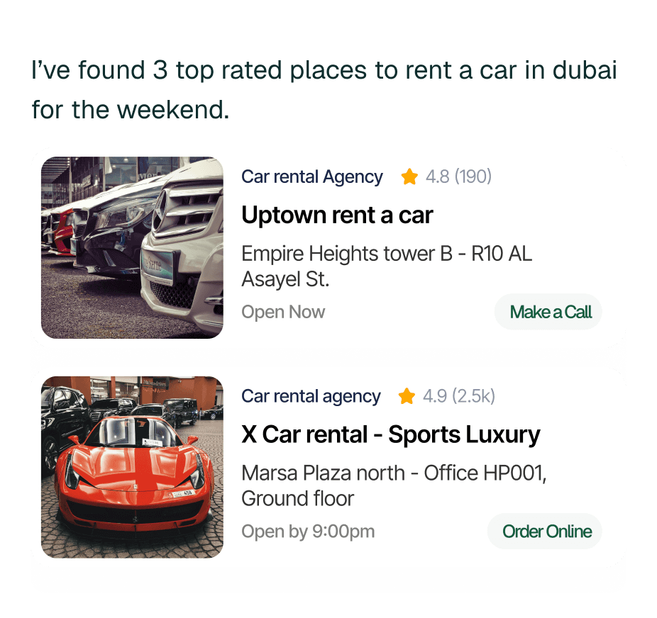 You just say, “Find parking near Mall of the Emirates,” or “Rent an SUV for the weekend.