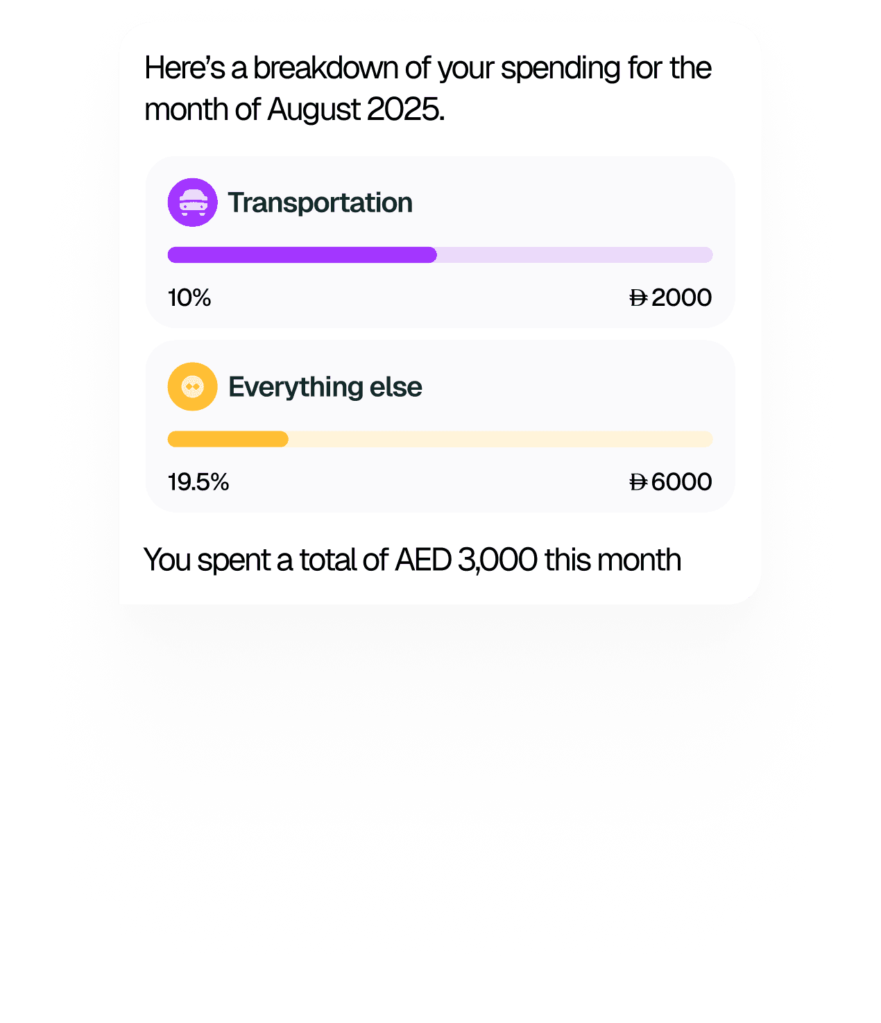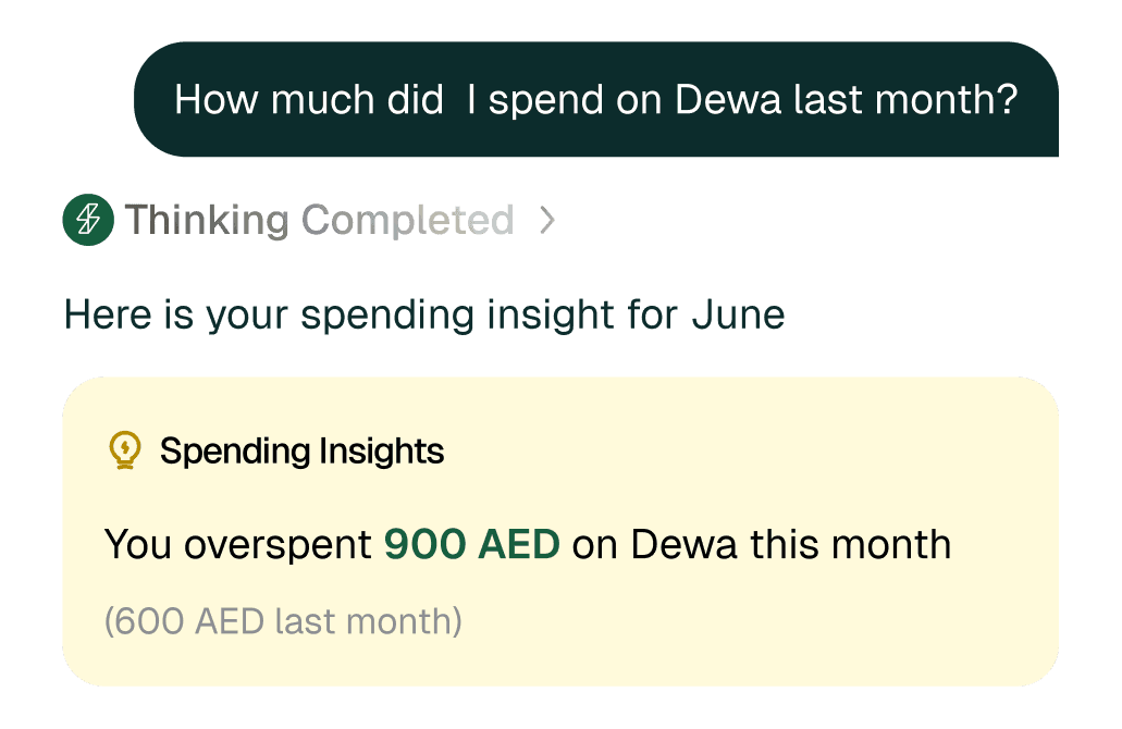 You can ask, “How much did I spend on food this month?” or “Compare my DEWA bills to last month.