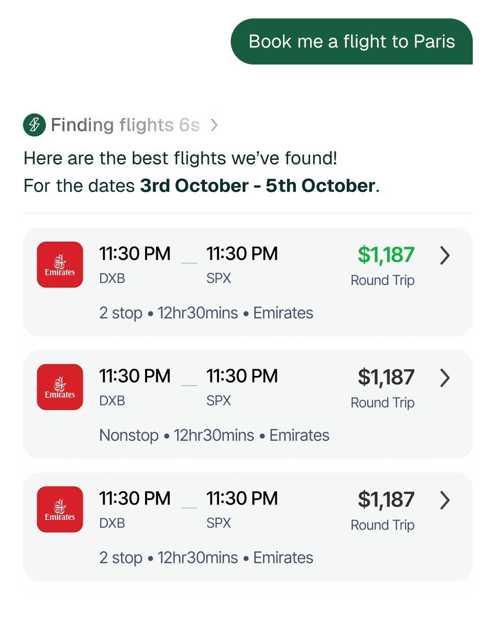 Type, “Find a flight from Dubai to Paris on Friday,” and your options appear instantly.