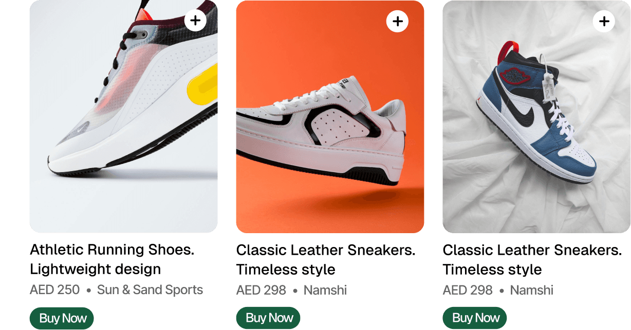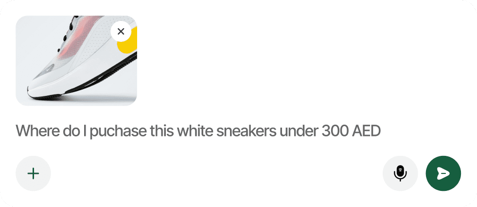 Type “white sneakers under 300 AED” or upload a picture.