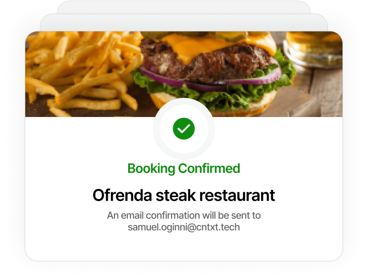 It searches trusted restaurant networks, checks live availability, and confirms your booking.
